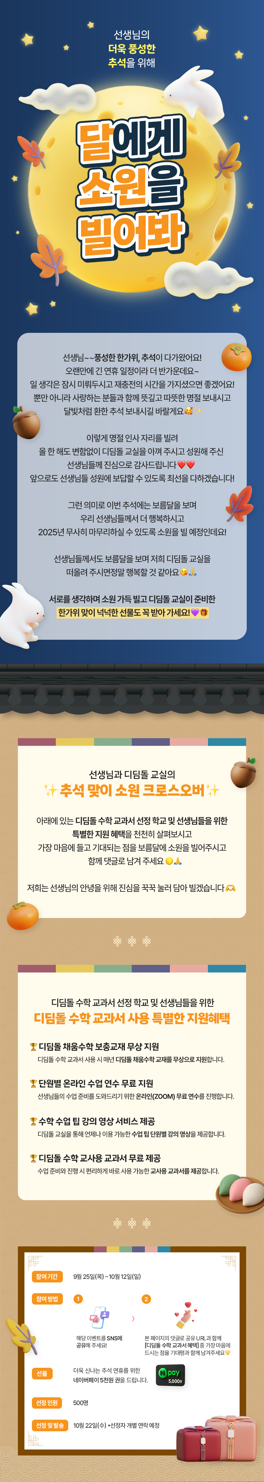 디딤돌 교실 2025 추석 이벤트 종료된 이벤트 입니다. 9/25/25 ~ 10/12/25 디딤돌 교실 2025 추석 이벤트 이전글 T키타카_자료꿀단지_이벤트 다음글 온라인 수학 수업 무료 연수 4탄(4단원) 목록