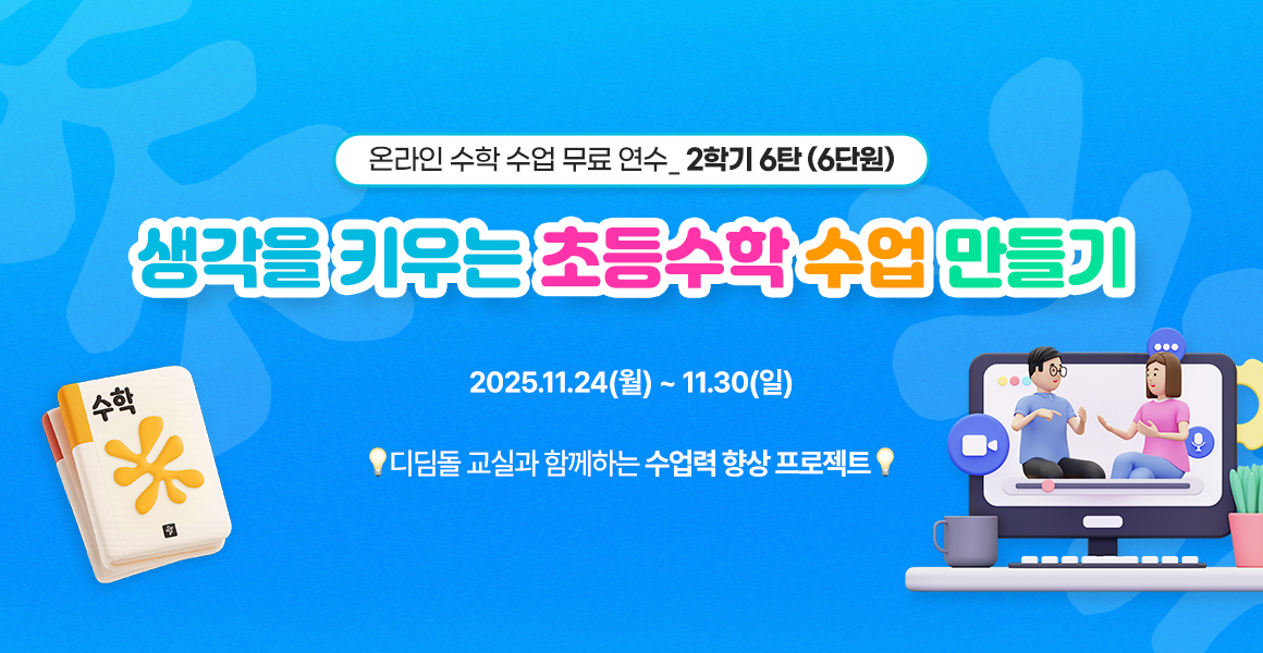진행중인 이벤트 디딤돌교실 선생님을 위해 준비한 다양한 이벤트에 참여해 보세요. 온라인 수학 수업 연수 6차 11/24/25~11/30/25 디딤돌 AIDT 교육 자료 체험관 10/23/25~11/30/25 1
