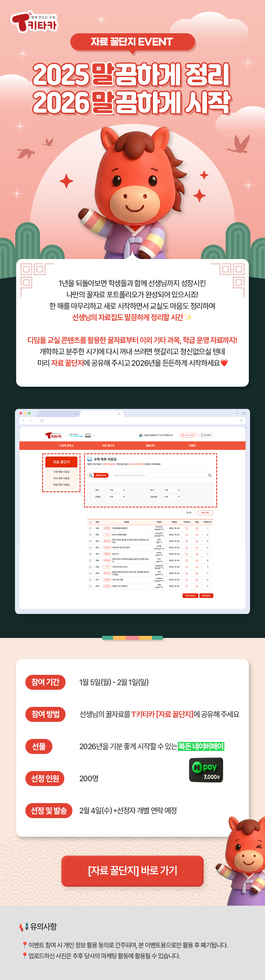 2026 T키타카_자료 꿀단지_이벤트 1/5/26 ~ 2/1/26 공유하기 2026 T키타카_자료 꿀단지_이벤트 로그인 후 댓글 입력 및 열람 가능합니다. 이전글 T키타카_2025 연말_지금 우리 교실은 이벤트 다음글 다음 글이 없습니다. 목록