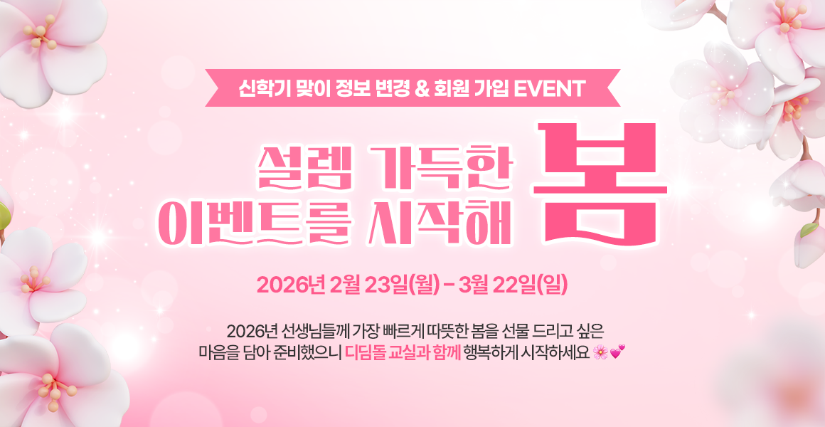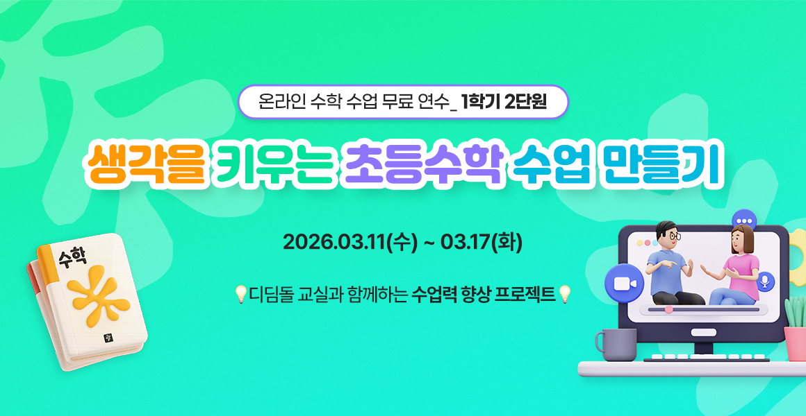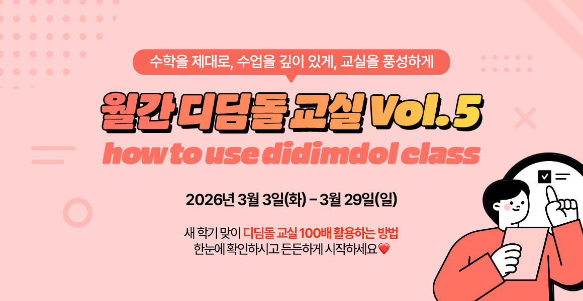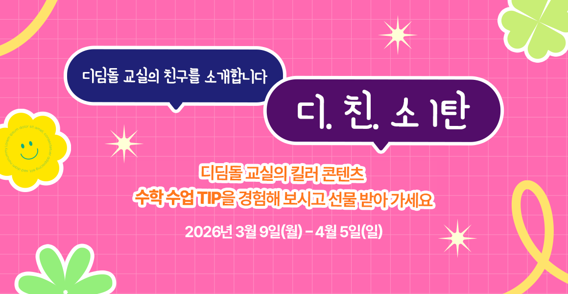진행중인 이벤트 디딤돌교실 선생님을 위해 준비한 다양한 이벤트에 참여해 보세요. (2026) 온라인 수학 수업 연수 1학기 2차 3/11/26~3/17/26 디친소_수학 수업 tip 활용 이벤트 3/9/26~4/5/26 월간 디딤돌 교실 5호 3/3/26~3/29/26 2026 신학기 맞이 정보 변경 및 회원 가입 이벤트 2/23/26~3/22/26 1